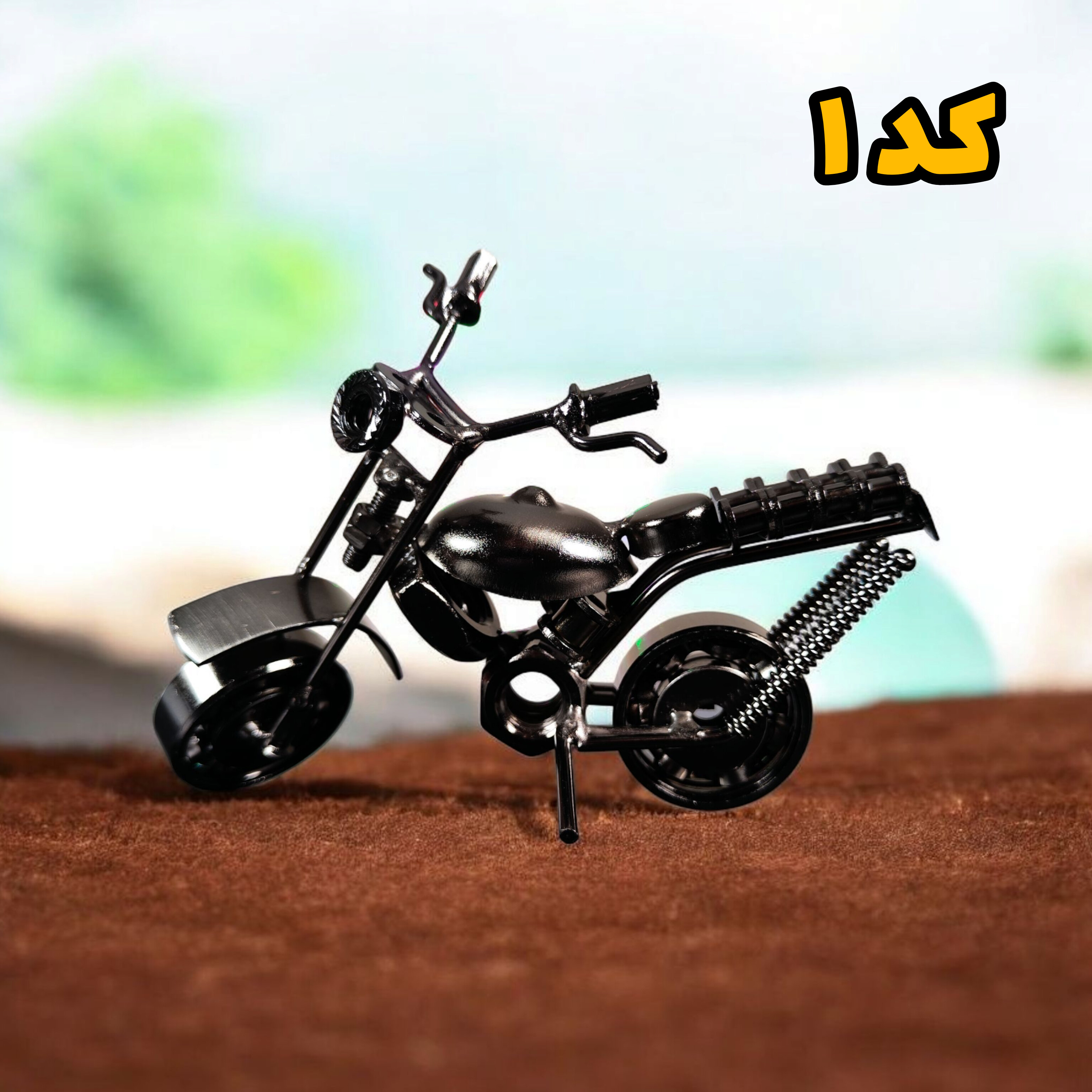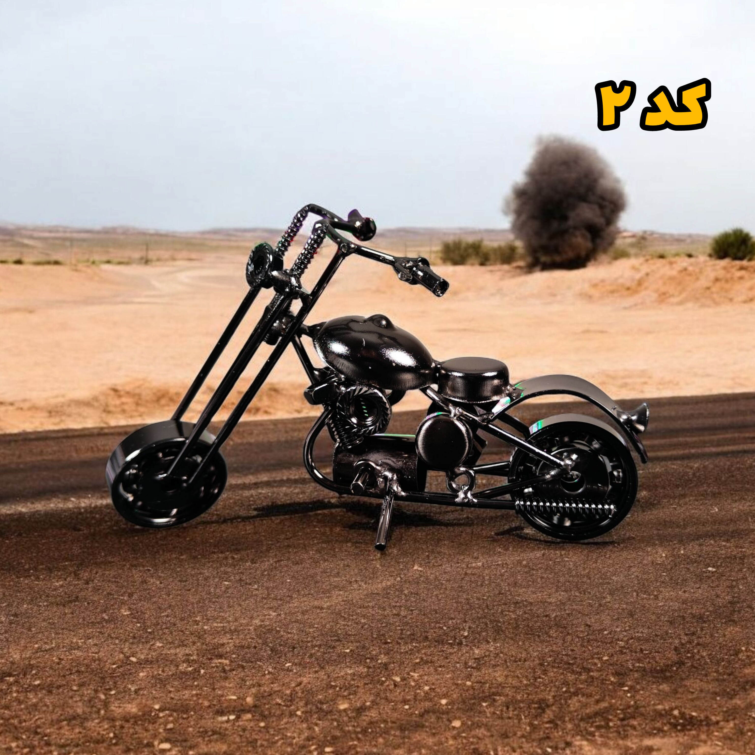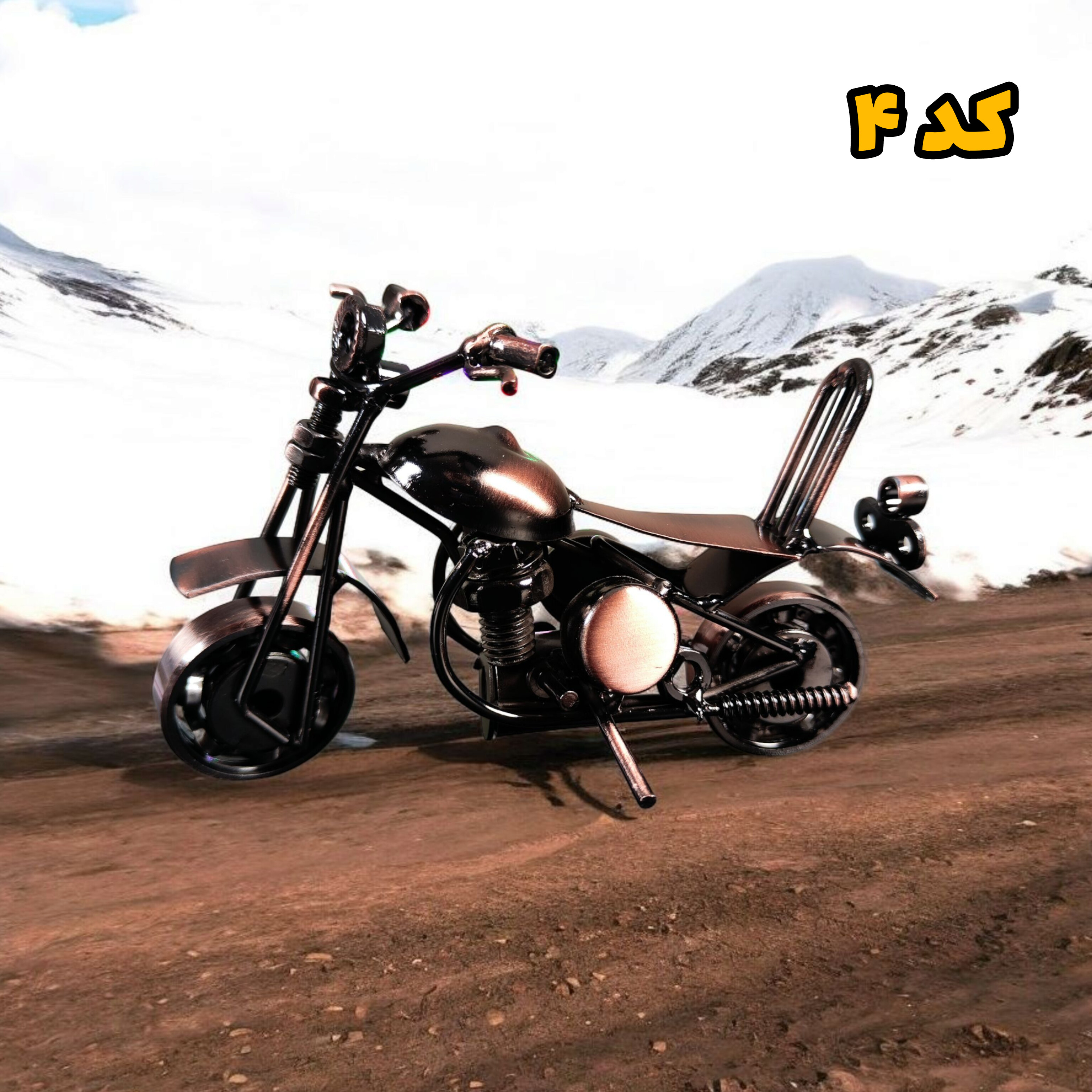 یه موتور سیکلت تمام فلزی که سر تا سر خلاقیت و جذابیته ، این محصول با دقت تمام از پیچ و مهره و بلبرینگ و قطعات فلزی دیگه ساخته شده ، جک داره ، چرخهاش گردانه ، فرمونشم گردانه