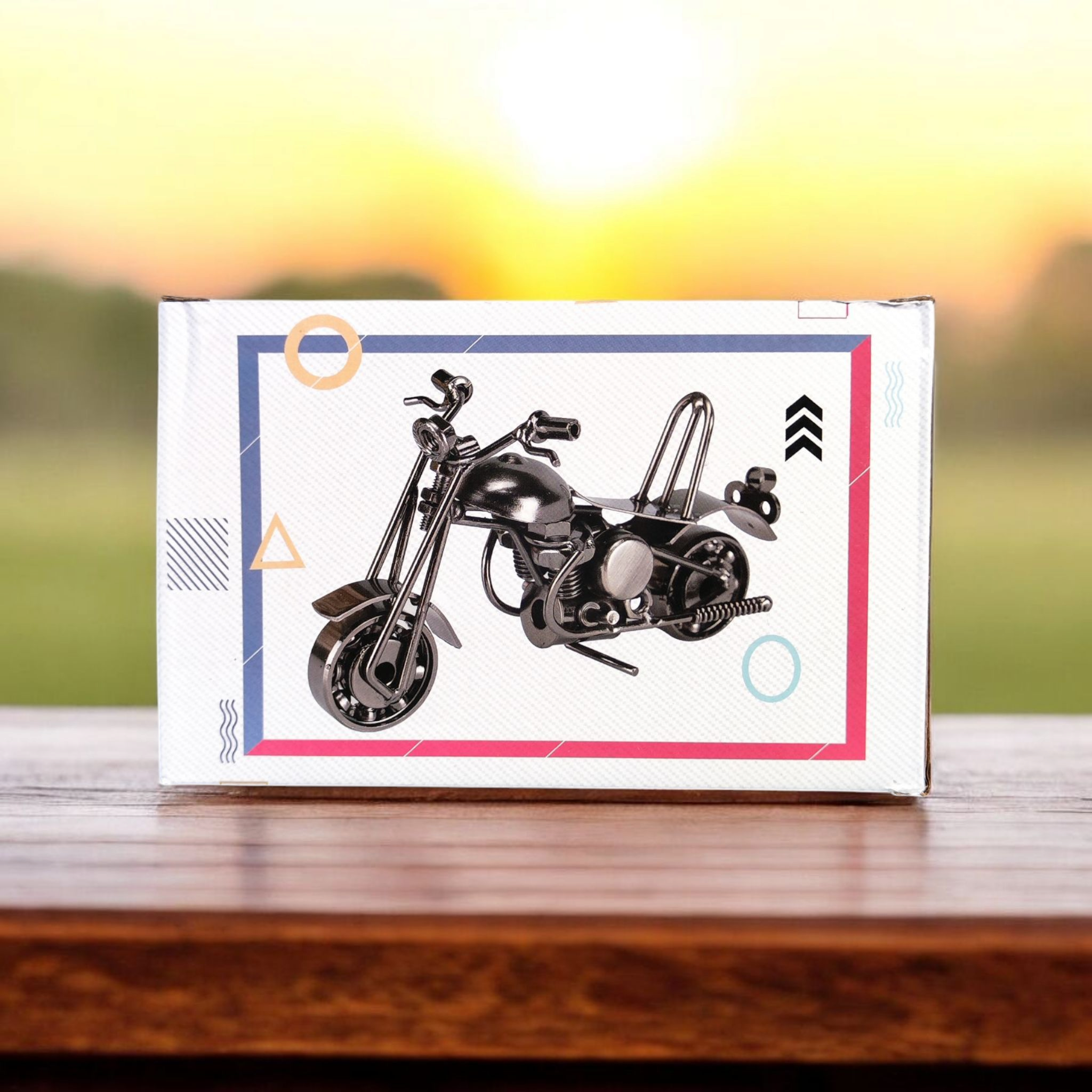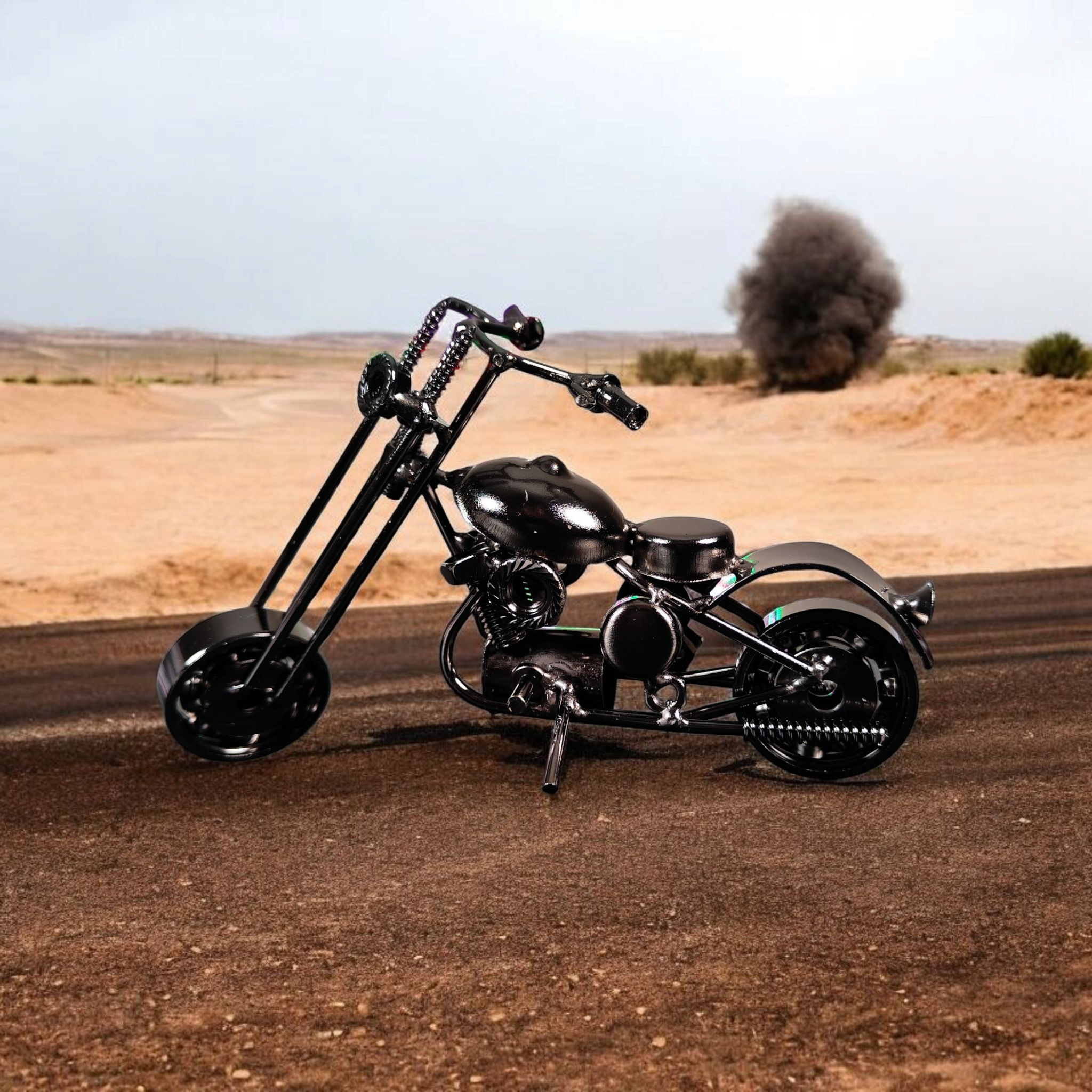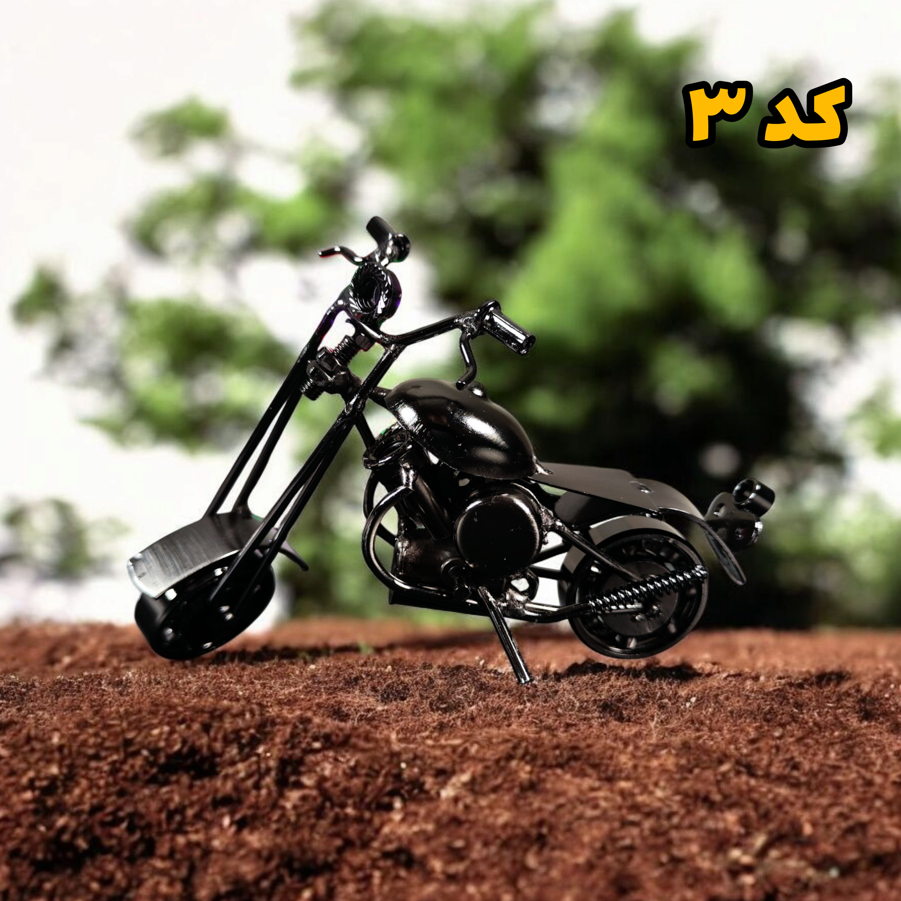 یه موتور سیکلت تمام فلزی که سر تا سر خلاقیت و جذابیته ، این محصول با دقت تمام از پیچ و مهره و بلبرینگ و قطعات فلزی دیگه ساخته شده ، جک داره ، چرخهاش گردانه ، فرمونشم گردانه