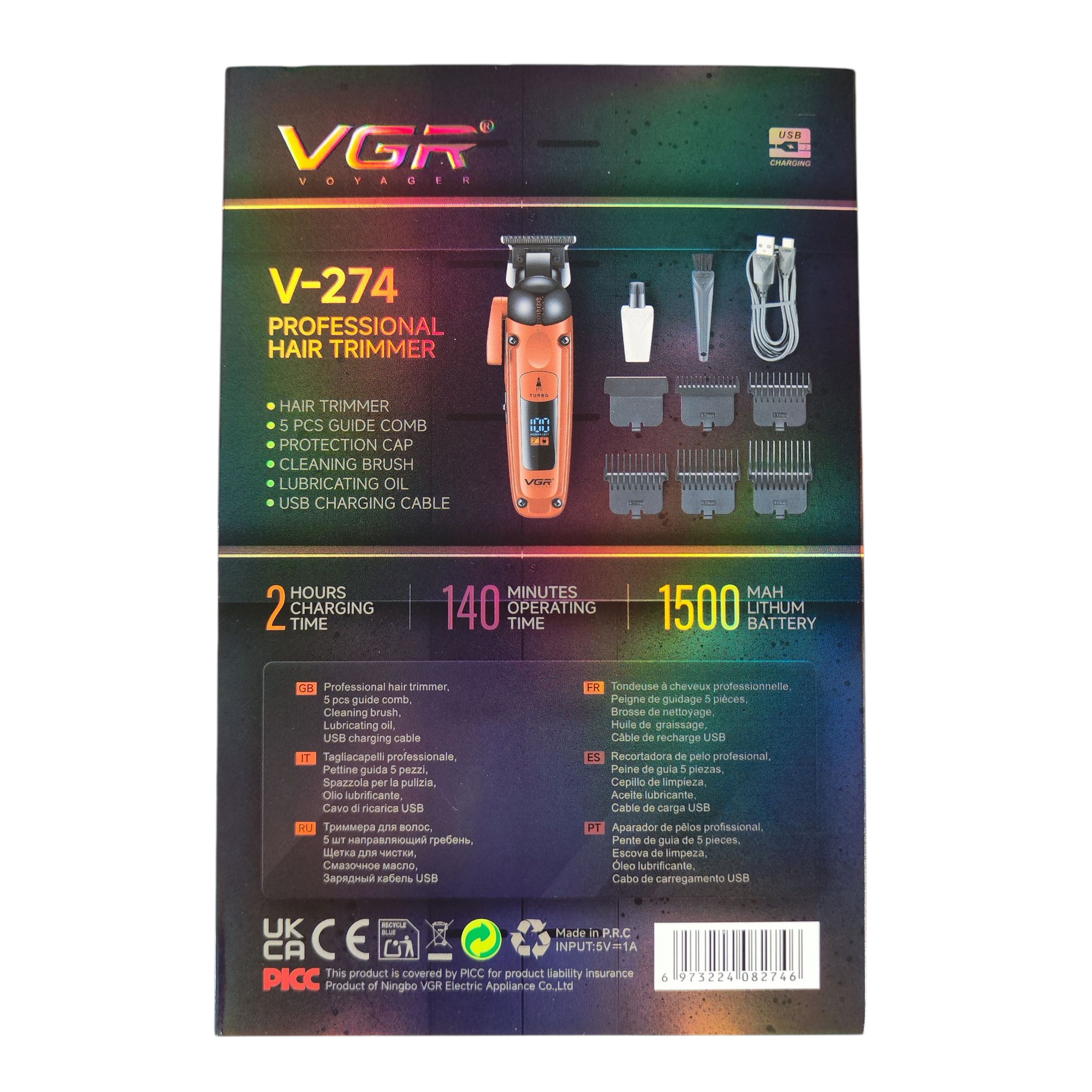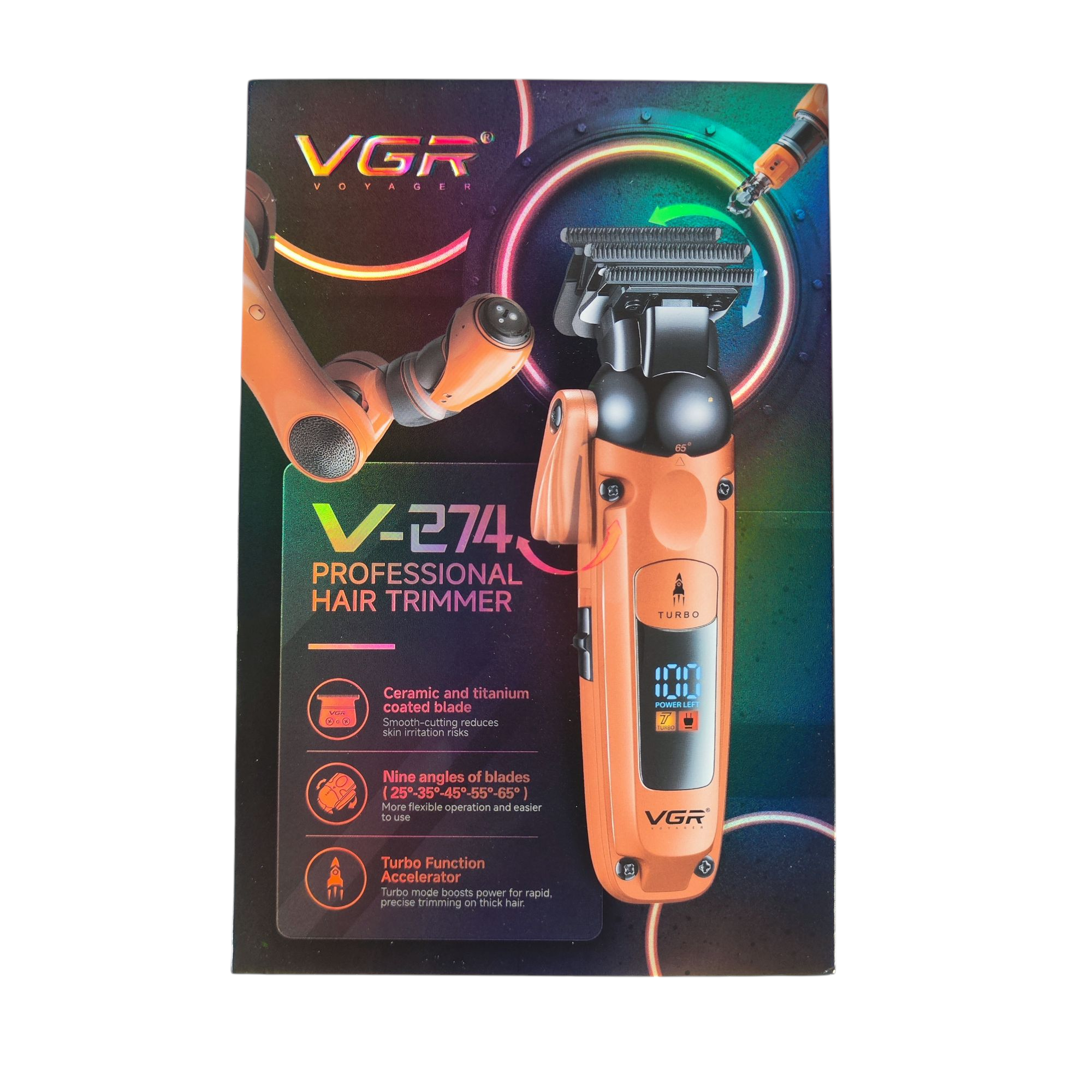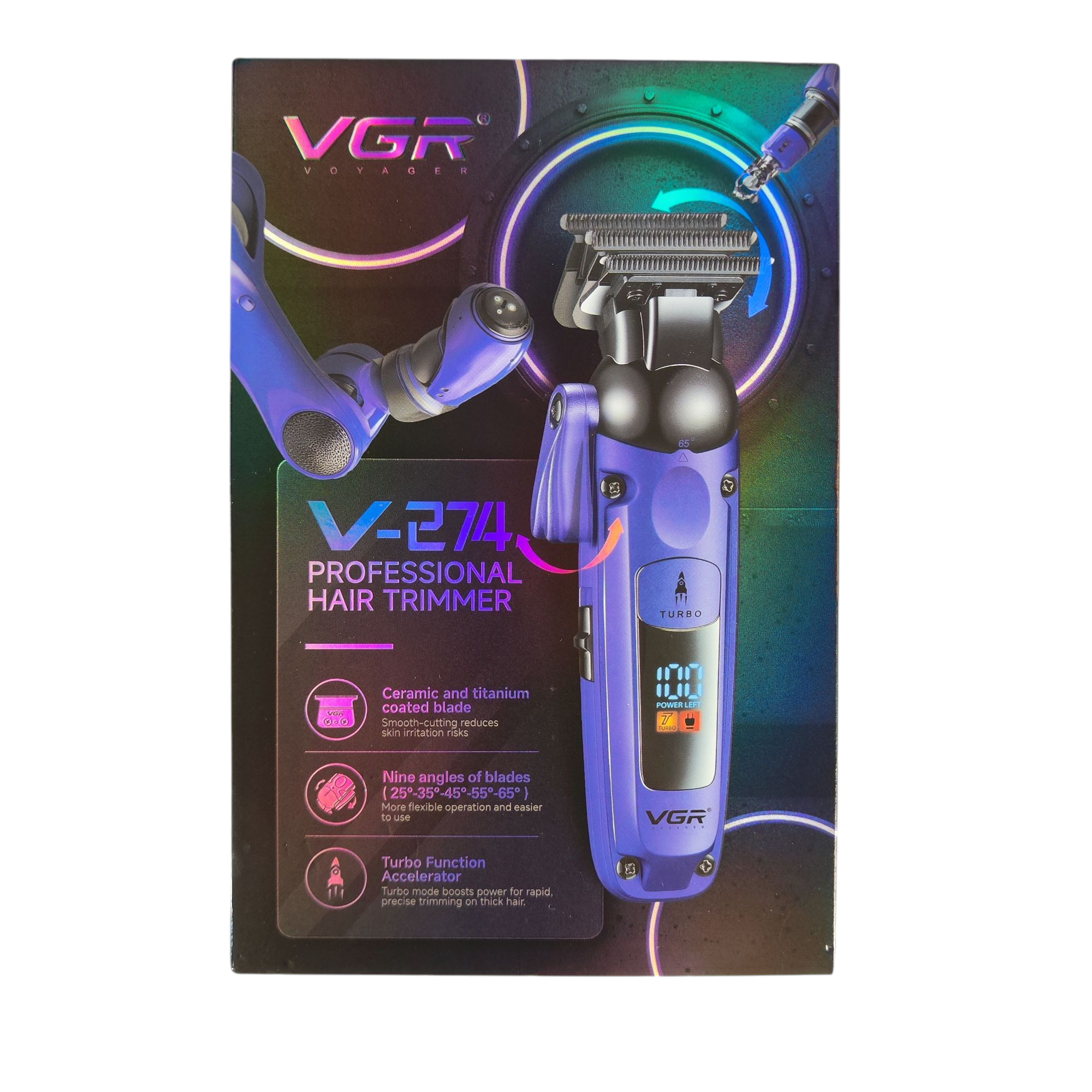 اصلاح سر و صورت، اولین اصل در آراستگی آقایان است. این قاعده مهم و تاثیرگذار، به ابزارهای خاصی نیاز دارد که به لطف انقلاب صنعتی، برقی و مکانیزه شدهاند. ماشین اصلاح موی VGR V-۲۷۴ یکی از اکسسوریهای شارژی مناسب برای آقایان بوده که VGR در بازار آن حسابی نفوذ کرده است. این ماشین اصلاح میتواند موهای شما را با موتور10 وات پر قدرت اصلاح می کند طراحی زیبا کیفیت عالی ، ماشین اصلاح VGR V-۲۷۴ سری جدید با تضمین اصالت دارای تیغه با الیاژ سرامیک و تیتانیوم و همچنین باتری ۱۵۰۰ میلی آمپری بسیار با دوام و قدرتمند ، با موتور 7000 دور با کیفیت و کم صدا ، با قابلیت استفاده بیسیم و باسیم یک ماشین اصلاح بسیار با کیفیت ، ایده ال و قدرتمند برای اقایان است ، همچنین این ماشین اصلاح دارای صفحه نمایش جهت نمایش درصد شارژ ،دکمه توربو برای تغییر دور و شانه های کامل همراه است